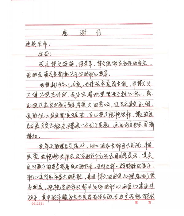 在此,为感谢艳艳老师对孩子的付出和努力,仅仅以此信表达我对瑞曼艳艳老师的衷心感谢!并祝愿老师工作顺利,新年快乐!