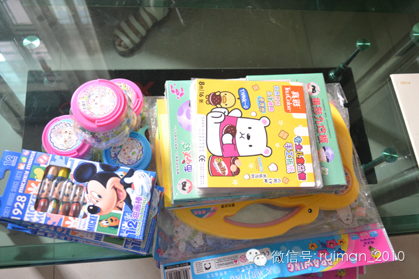 捐赠清单:油画棒7盒;蛋形九巧板4盒;图画本7本;彩泥玩具4桶;画写板4个;手工折纸7本。