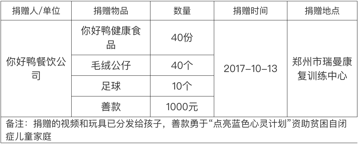 你好鸭餐饮公司给瑞曼孩子带来礼品和善款