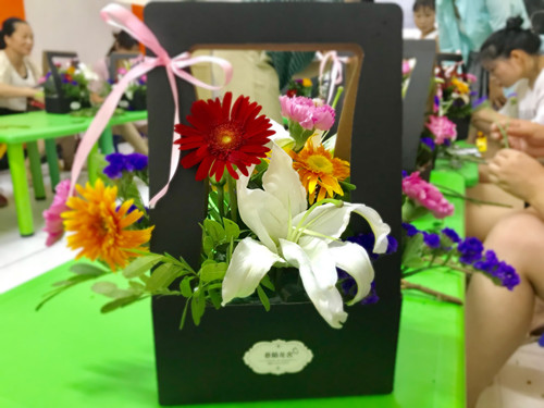 推开门,花香扑面而来,沁人心脾,家长们一个个全身心投入,挑花、摘花、剪花、插花一气呵成,瞬间一盆盆绚丽的花篮呈现在眼前,家长轻松自在的笑容映衬着锦簇的花团,画面赏心悦目。
