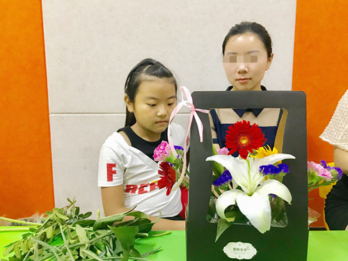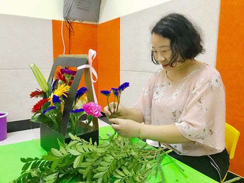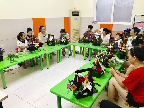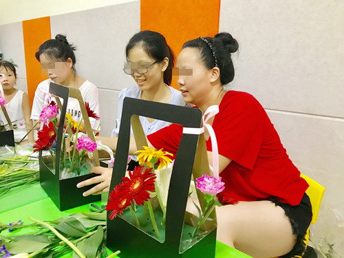 花艺老师熟练的讲述的插花教程,家长们时而侧耳倾听;时而深思轻轻拨动自己的花篮力求完美;时而交耳轻声交流心得......这一刻家长们完全沉浸在花的海洋里,没有压力没有忧虑没有一切喧嚣,彻底放松身心,这也正是我们开设课堂的意义所在,放松压力,轻灵身心。
