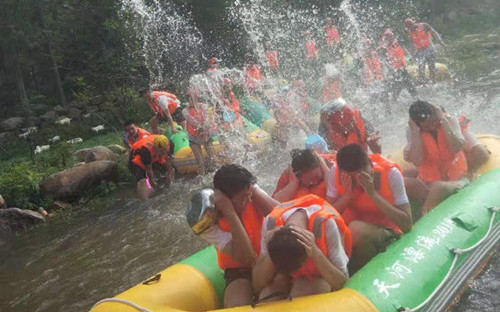 我们到了目的地已是中午,大家匆忙的吃了个午饭,就直奔漂流而去。虽然排队等候多时,但是这一点也不影响想我们激动的心。终于到我们下水了,坐上小船沿着溪水漂流而下,最先遇到的就是很大的水流落差,激流的水把我们全身都打湿了,真是惊险万分。整个漂流既有平缓如镜的慢漂,又有波涛汹涌的险漂,但经过我们的共同努力,互相配合都有惊无险,我们共同抵挡、团结、共抗,然后湿漉漉的哈哈大笑。漂流带给我们的不仅是激荡冲击、战胜自然的快感,还有整个过程中与同伴一起努力的喜悦,和感受大自然带给我们的一切美好。