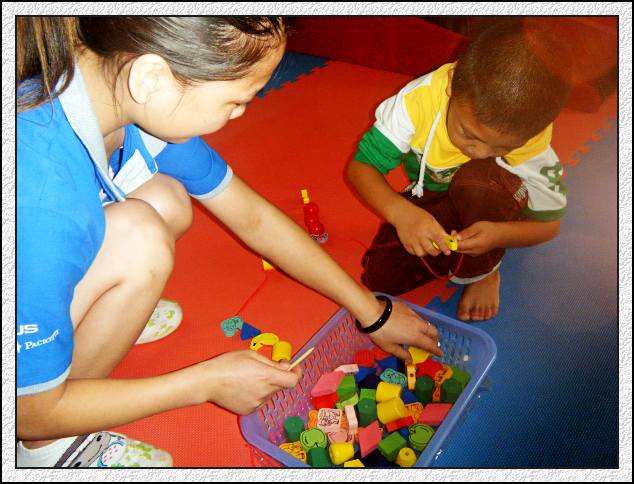 冉老师与小骜在做穿珠游戏(目的:精细训练、注意力训练、视动协调)