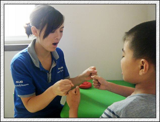 张老师和小旭在做气流量的训练(根据孩子的兴趣点,教具可以多样化。)