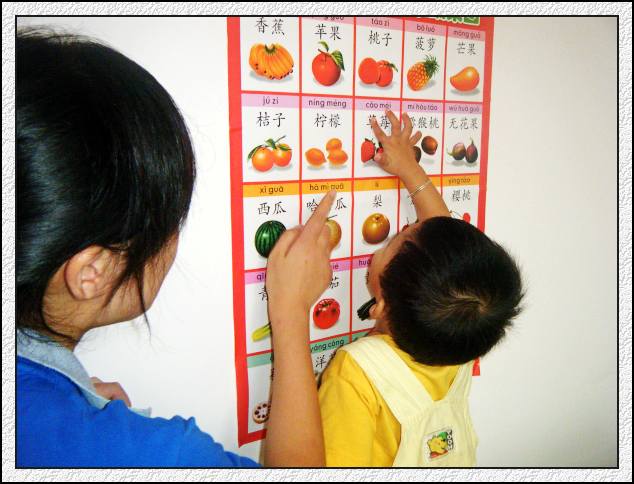 冀老师在给小妙做认识训练(指一指,哪个是草莓?)