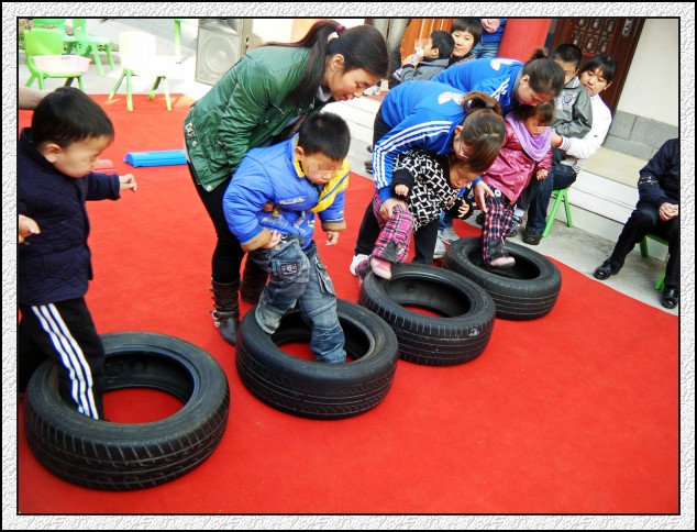 孩子在家长和老师的辅助下蹦轮胎