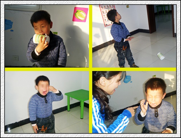 3、语言能力:1、无语言表达能力,但会自发性的发一些音,如“不干”、“爸”、“妈”。2、有气流但不会运用。3、上下颌关节紧张,舌位灵活度差。