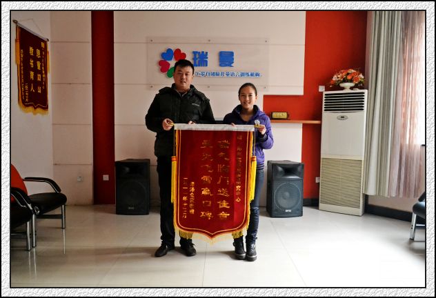 12月28日上午,泽泽妈妈把一面印有“瑞气临门送佳音 曼天飞雪赢口碑”的锦旗赠予瑞曼,表达了对瑞曼和老师的感激之情。特别的是他们还把瑞曼两个字加了进来,做为上下两句的起始字。