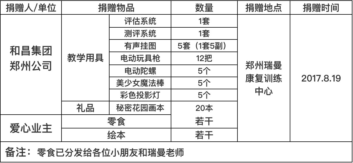 和昌集团和爱心业主为瑞曼星儿捐赠教具和礼品
