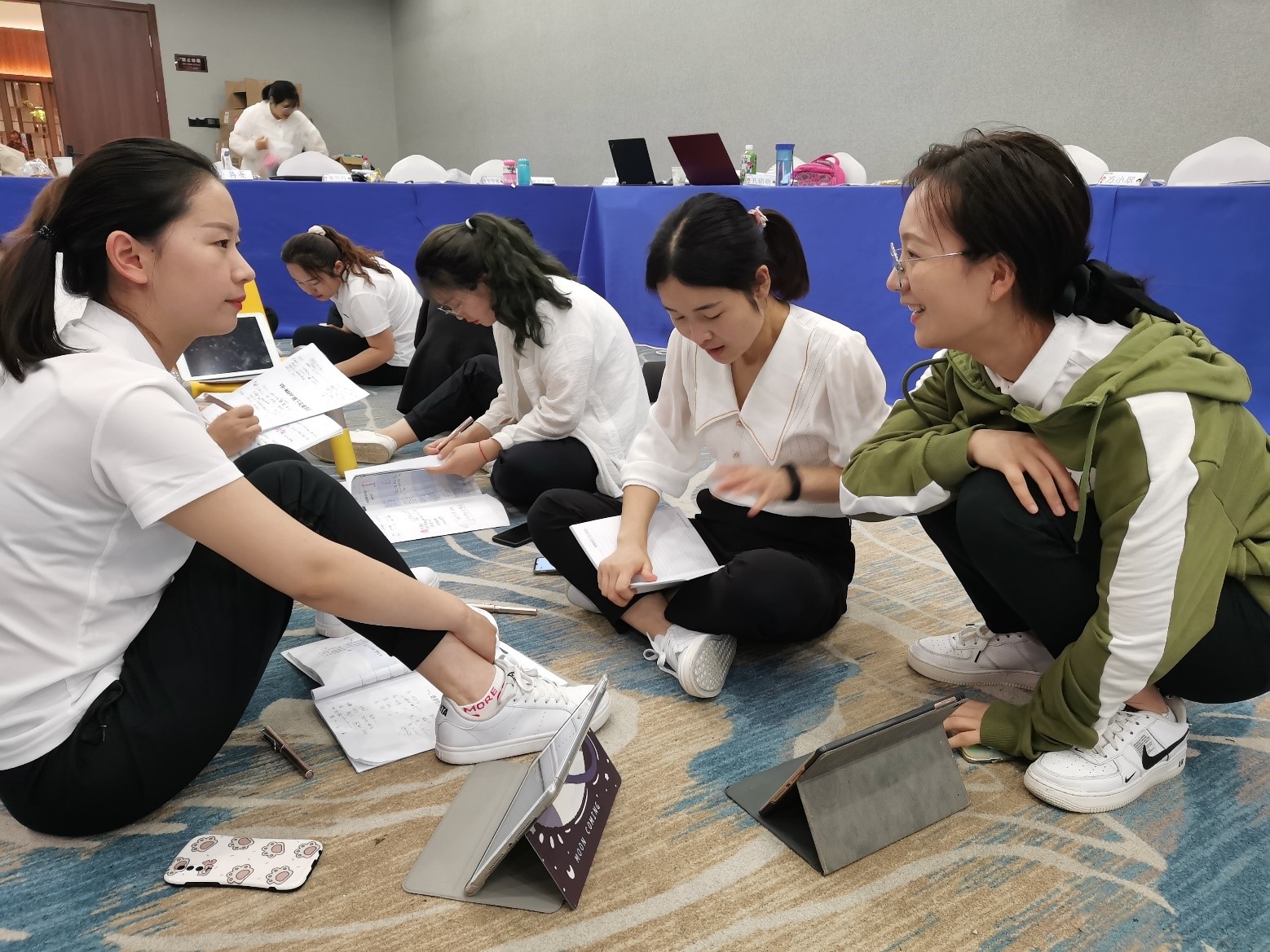 开始上课了,老师们一个个像刚入学的小学生似的,乖乖的坐在椅子上听老师讲课。这群姑娘们求知若渴,迫不及待的拿出书本记笔记;提问环节时,个个踊跃参与,唯恐落后了老师不能解答自己的疑问。
