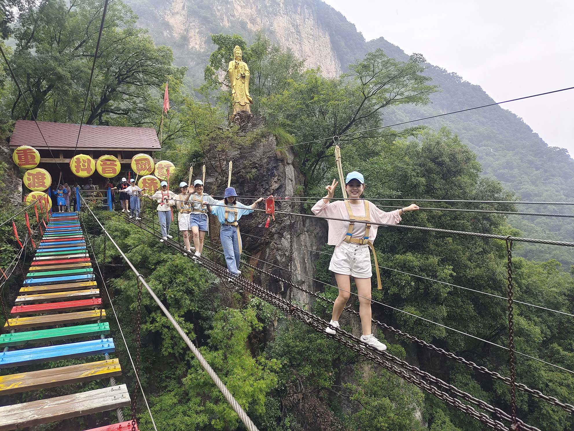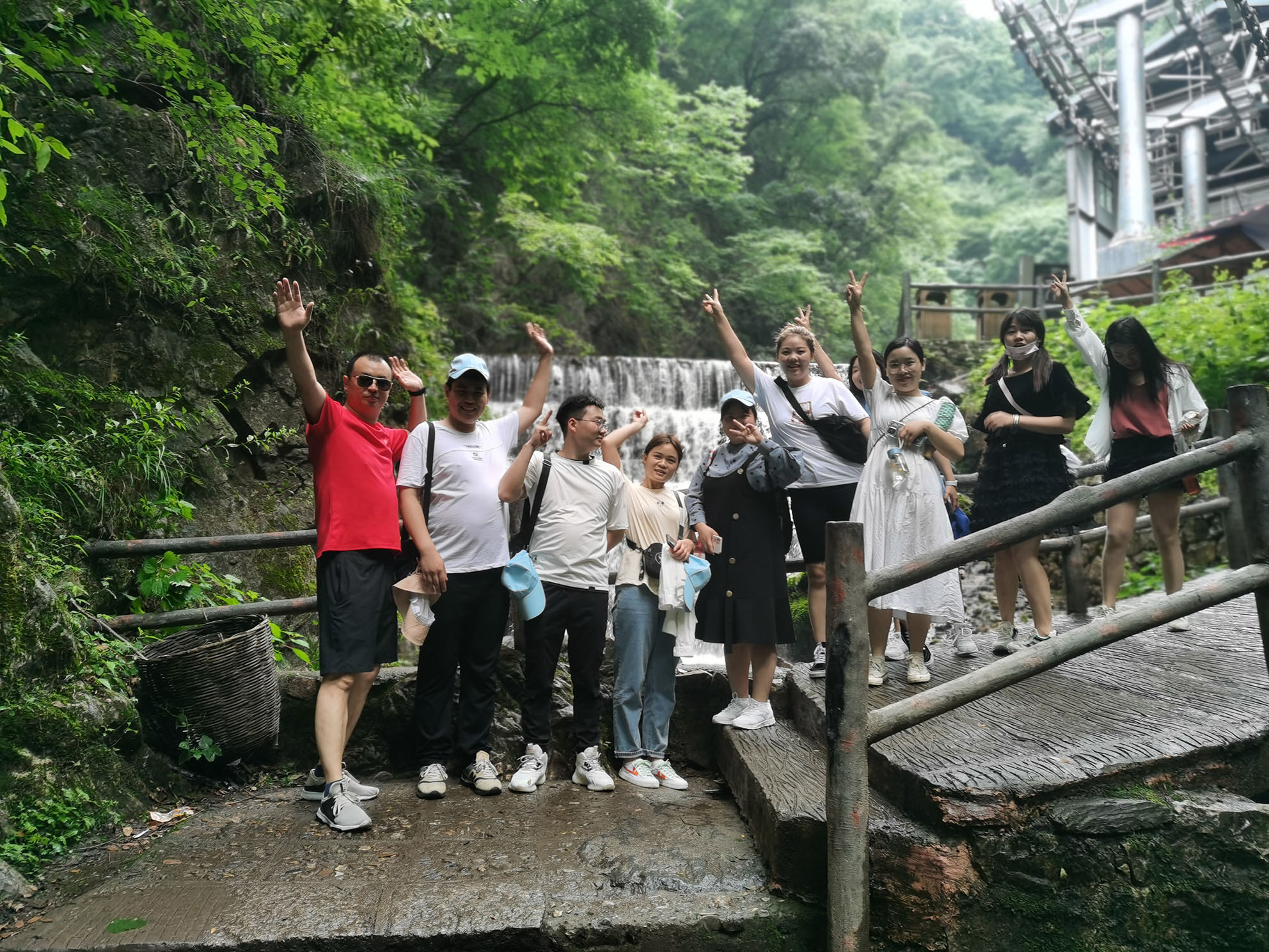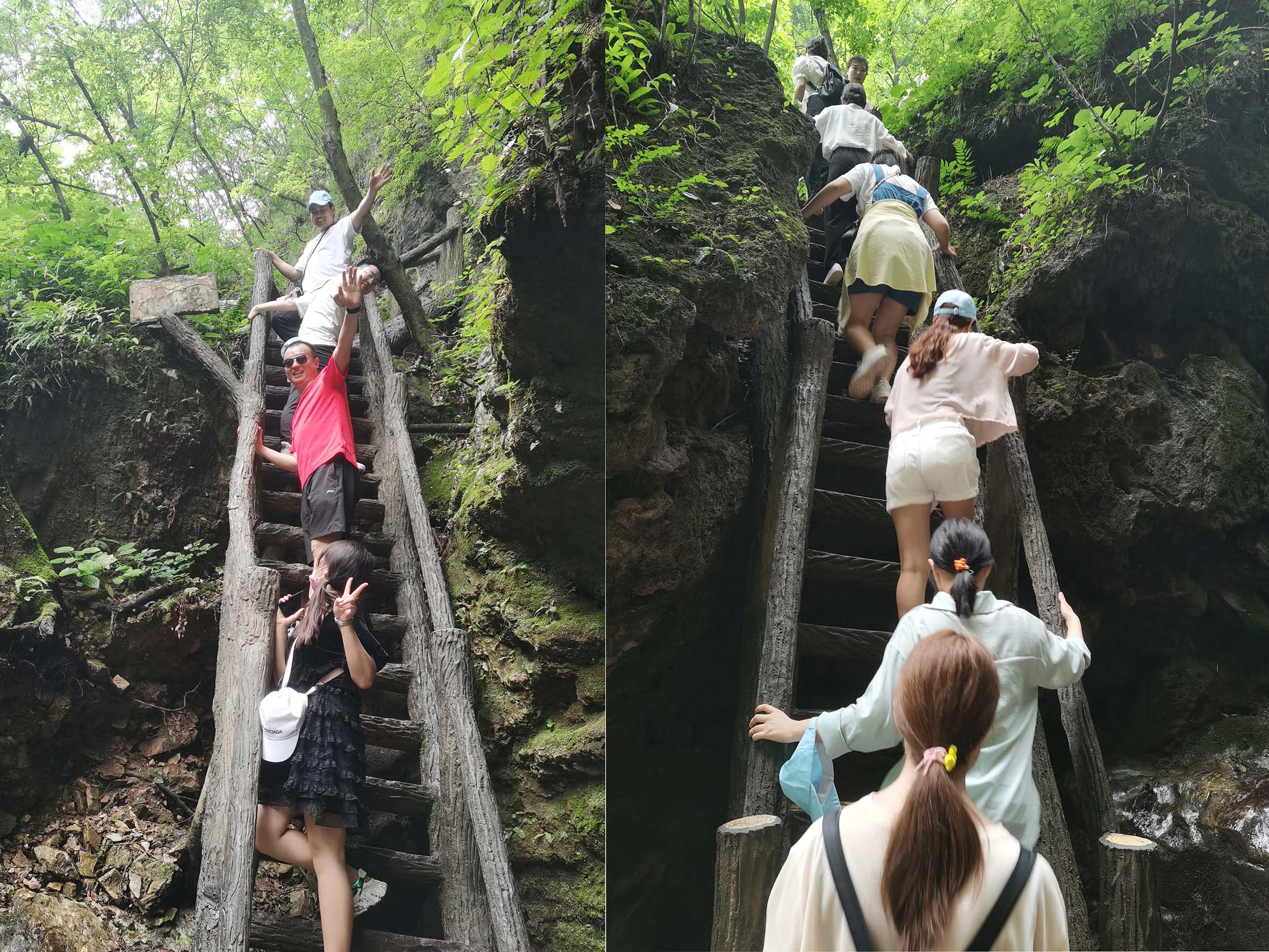 通过4小时的车程中午到达重渡沟景区,就餐之后正式开启了我们的旅游观光之旅。浩浩荡荡的大部队开始向顶峰发起冲击,途中我们一起爬了90°陡坡,一起走了网红桥,一起坐了滑索,虽然有些小伙伴害怕大叫,但在集体的力量下,我们克服了恐惧,尝试了从未尝试的游戏。