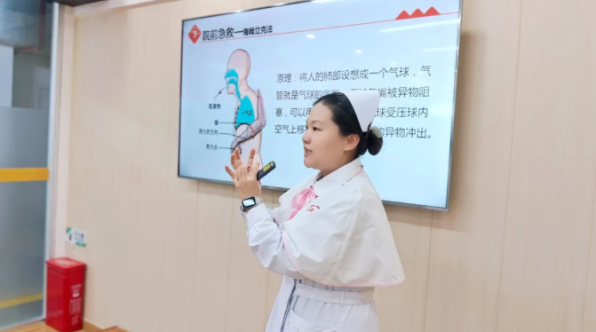 郑婧护士长先是对婴幼儿常见的气道异物梗阻的急救进行了讲解,特别突出了海姆立克急救法的应用场合及其关键动作。为了更直观易懂地讲解这一急救方法,她巧妙地运用“剪刀、石头、布”三个熟悉的手势,形象地概括了海姆立克急救法的核心步骤与要点。