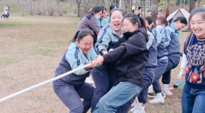 最燃的当属拔河赛场!4 支战队两两对垒,队员们紧紧攥住粗麻绳,身体后倾、重心下沉,一个个脚蹬草坪、腰杆绷直,脸上写满坚毅。“一二!一二!” 队长的口号铿锵有力,队员们齐声呼应,麻绳中间的红绸带在两队之间来回拉扯,僵持不下。有的老师手掌被绳子勒得发红,却死死不肯松手;有的拼尽全力后重心不稳摔倒,爬起来立刻重新加入战斗。场边观众加油声震耳欲聋,当红绸带终于越过己方界线时,获胜队伍相拥欢呼,这就是团队协作的力量!