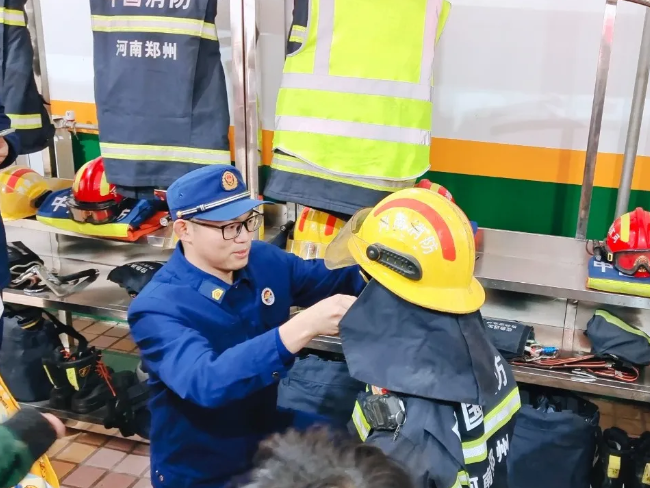 最让孩子们兴奋的,莫过于亲身体验环节。大家不仅轮流提起消防水管,真切感受到了它沉甸甸的重量,明白了消防员叔叔灭火时需要付出多大的力气。随后,消防员叔叔展示了厚重的消防服,详细讲解了每一个部件的防护功能。孩子们迫不及待地试穿消防服、戴上头盔,瞬间化身成一个个“小小消防员”,自豪感油然而生。