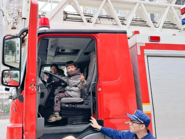 体验的最后,孩子们排着队和高大的消防车合影留念,消防车车身不低,孩子们爬上去时都有些吃力,有的小手紧紧抓着扶手,有的脚步迈得小心翼翼,但没有一个孩子退缩,都凭着自己的力量独立完成了登车挑战。一旁的消防员叔叔始终耐心守护在旁,不时轻声鼓励、适时帮扶,确保每个孩子的安全。一张张笑脸定格在镜头里,也定格了这段难忘的记忆。